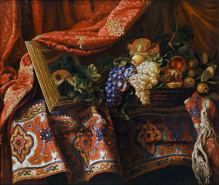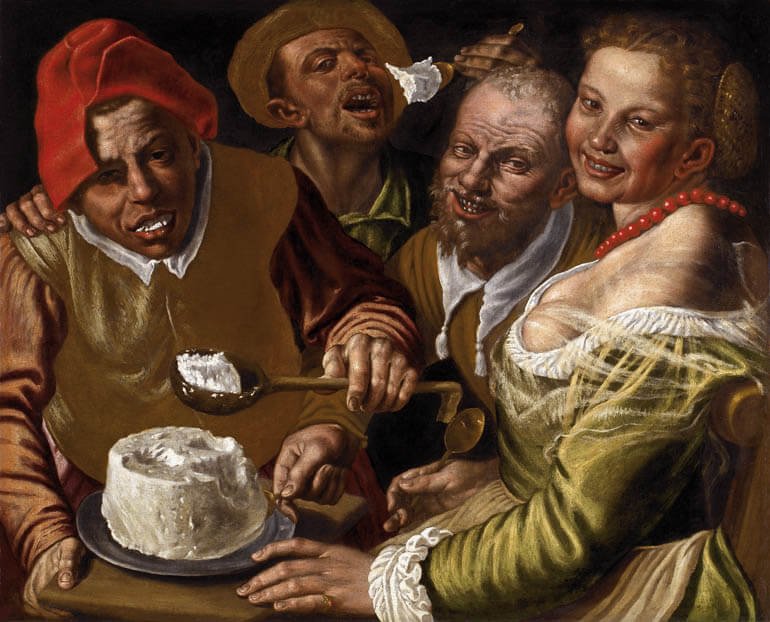 Tramortiti da zucche giganti, mostri marini appena pescati, dolci che fanno ingrassare soltanto a guardarli, si ha però come l’impressione che a volte gli artisti tentino di nobilitare il di per sé nobilissimo soggetto del cibo “guarnendolo” di una cornice raffinata. Si veda per esempio la cura con cui vengono resi il tappeto disposto sotto la cesta e la pesante tenda rossa orlata d’oro nell’opera Cesto di frutta e specchi su tappeto di Francesco Noletti. Il tappeto doveva essere un cavallo di battaglia dell’artista, visto che ritorna anche nel quadro che raffigura un piatto con dolciumi esposto al piano superiore, nella sezione Vino dolci e liquori. Che poi i “social” non abbiano inventato nulla, tanto meno l’esibizione del cibo che ora passa sotto il nome di “foodporn”, ma al massimo estremizzato un fenomeno antico, lo dimostra un’opera come La merenda del contadino di Giacomo Francesco Cipper, detto il Todeschini. Mostrare agli altri quello che si sta per mangiare, un po’ per condividere, ma più che altro per provocare invidia, non è dunque una novità.