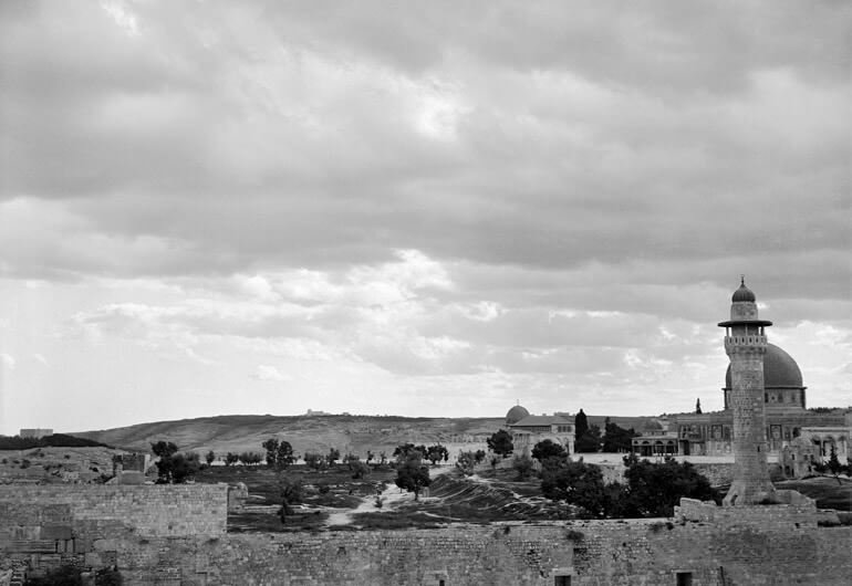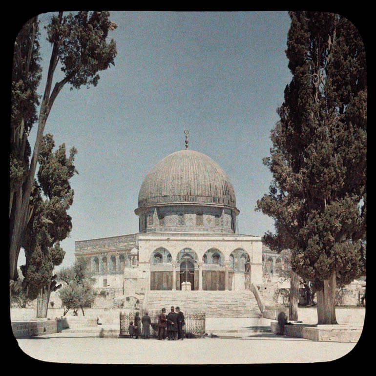 La prima cosa che si nota nelle foto è l’assenza delle masse di turisti in pantaloncini, anche se l’homo turisticus era già stato scoperto. Robert Byron racconta con amarezza di essere stato definito “turista” da una guida di Baalbek, in Libano. Correva l’anno 1933. Lui stesso lo racconta ne La via per l’Oxiana, tradotto in italiano da Adelphi. Ma nella maggior parte degli scatti le uniche presenze umane immortalate sono persone del luogo, messe in posa per servire da termini di paragone per gli edifici alle loro spalle. Per il resto Gerusalemme più che Santa sembra una città fantasma, in cui il sole del Vicino Oriente con i suoi forti contrasti chiaroscurali trasforma i panorami in paesaggi lunari.