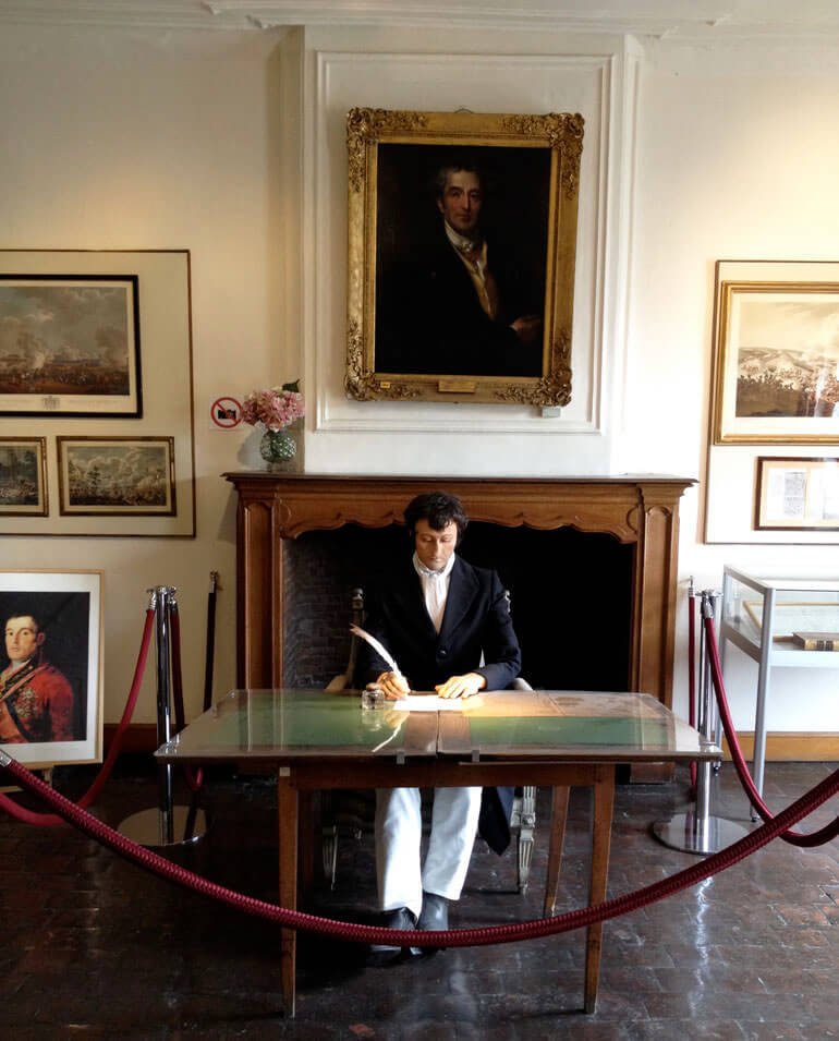 MuseoWellington_2Le sale espongono documenti originali, reperti della battaglia, cartine e schemi che consentono di farsi un’idea (per quanto possibile!) della battaglia. Un foglio di carta ingiallita è la pagina del Times del 22 giugno 1815 che riporta – tre giorni dopo – il primo resoconto dello scontro: ai tempi non esisteva la CNN, figurarsi Twitter! Fornisce l’elenco dei morti e dei feriti, tra gli ufficiali di più alto grado, naturalmente. Su una parete è appesa una stampa d’epoca, colorata a mano, con la raffigurazione del trasferimento di Napoleone dal Bellerophon alla fregata HMS Northumberland che l’avrebbe deportato a Sant’Elena. Chi scrive ne ha una identica sulla scala di casa… Una sala ospita la scrivania seduto alla quale Wellington scrisse, ormai scesa la notte, il famoso annuncio della vittoria, mentre un planisfero rivela che in giro per il mondo ci sono più di un centinaio di altre Waterloo, semi sparsi dopo la vittoria alle porte di Bruxelles. Per scoprirne l’ubicazione basta premere un pulsante e osservare l’accensione di tante spie colorate. Per esempio se ne possono contare tredici soltanto in Australia, mentre in Africa occidentale ne sorge una a pochi chilometri da Freetown, capitale della Sierra Leone.