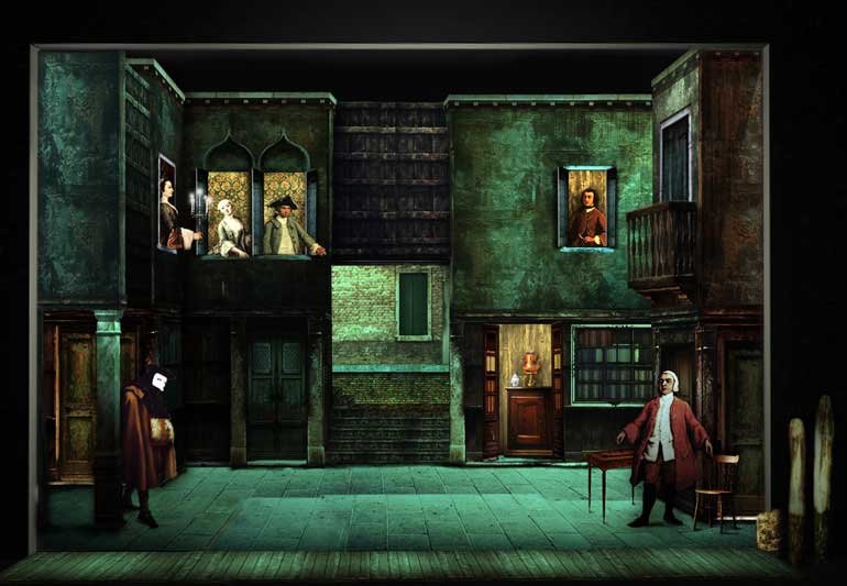 “Ci sono alcuni motivi che mi spingono a questa nuova edizione di La bottega del caffè”, spiega Scaparro, “Uno di questi è il piacere di tornare a parlare di Venezia e del suo Carnevale, durante il quale la commedia si svolge, dalle prime luci dell’alba, fino a quando scende la notte. E qui Goldoni sembra prendere le distanze dalla visione magica di una delle più belle città del mondo, per descrivere una Venezia comicamente deformata, che già allora rischiava di dimenticare la sua grandezza e di cedere alle tentazioni della bottega. Non casualmente Don Marzio, il protagonista, osserva le vicende descritte (e vissute) da Goldoni attraverso un occhialetto, diabolica lente, con cui spia curiosamente i fatti, le ipocrisie e le stravaganze delle persone”. Altri motivi sono la scelta del toscano da parte del commediografo e lo stretto legame con la musica.