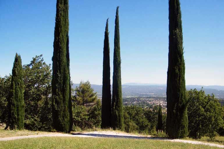 Salgo a piedi verso il paese, seguendo il tortuoso percorso segnato lungo terrazze fasciate di pietra, in un giardino di specie variegate, ognuna classificata dalla sua targhetta. Una tavola di orientamento in ceramica, con attorno acuminate lance di cipressetti scuri, consente di leggere il paesaggio: dalla cima – di un bianco lievemente azzurrato per la distanza – del petrarchesco Mont Ventoux ai gruppi di case disseminati sul fondovalle e sui colli acclivi.