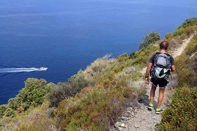 A un tratto il sentiero sbuca in un piccolo spazio all’aperto, lastricato e delimitato da pietre. Serviva come aia per i contadini che utilizzavano il vicino cascinotto alzato in muro a secco come ricovero per gli attrezzi. Il ritorno verso Nonza sarà segnato dal desiderio di una bibita fresca e dalla scia dei motoscafi che là in basso solcano il Tirreno, tracciando un percorso alternativo al nostro sentiero.
