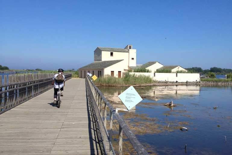 La sicurezza prima di tutto, sempre. Per questo è consigliabile indossare il caschetto, anche quando si percorre la pista ciclabile che costeggia lo stagno. Sul pontile di legno che porta all’Ecomuseo ci sono cartelli trilingui (francese, inglese e còrso) che hanno la funzione di introdurre i visitatori in un mondo “a parte”, naturale e proprio per questo delicato, accogliendoli con citazioni come questa di Francesco Bacone: “Per comandare alla natura, bisogna obbedirle”, oppure quest’altra verità formulata da Albert Jacquard (ricercatore e saggista francese): “Noi siamo i locatari temporanei di un pianeta magnifico ma fragile”.