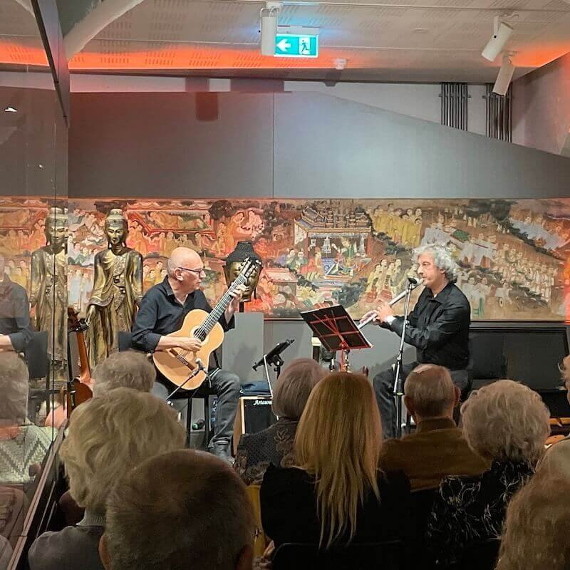 E proprio un viaggio sonoro tra musiche e culture diverse – per riprendere le parole di Zaniboni – è stato il concerto Suoni in controluce. Un viaggio avanti e indietro nel tempo e nello spazio, dal Giappone alla Francia, da un film all’altro. Sì, perché a fare da filo rosso sono stati i temi di pellicole che i due musicisti hanno scelto tra lo sterminato patrimonio di colonne sonore (soltanto Ennio Morricone ne ha composte oltre 500, ha ricordato Farinone). E quale contesto più appropriato del Museo Popoli e Culture per ascoltare uno dei temi più belli e celebri del maestro romano, ovvero Gabriel’s oboe dal film Mission di Roland Joffé?!