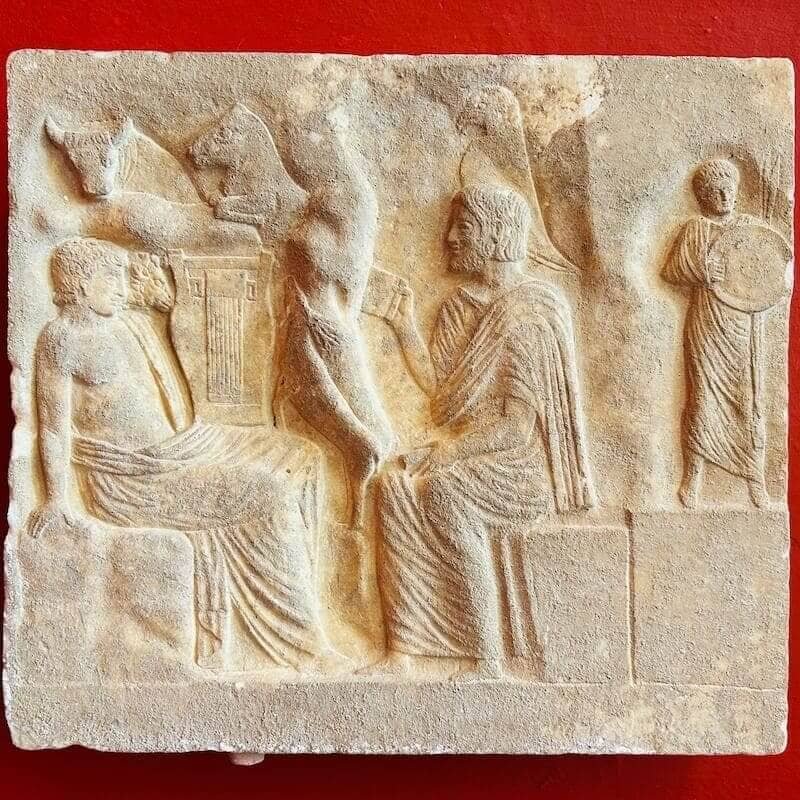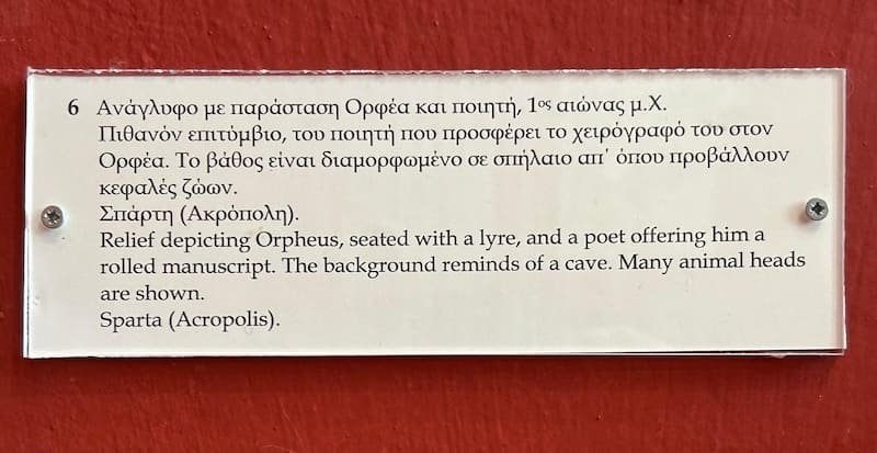Io e il poeta – di lì a poco “laureato” con il Nobel – abbiamo visto lo stesso rilievo votivo, ma abbiamo letto due didascalie diverse. Come potete verificare, quella che attualmente accompagna il reperto è totalmente diversa. Non fa alcuna menzione alla datazione all’età ellenistica, limitandosi a una sommaria descrizione della scena e a indicarne la provenienza. Il cartellino recita: