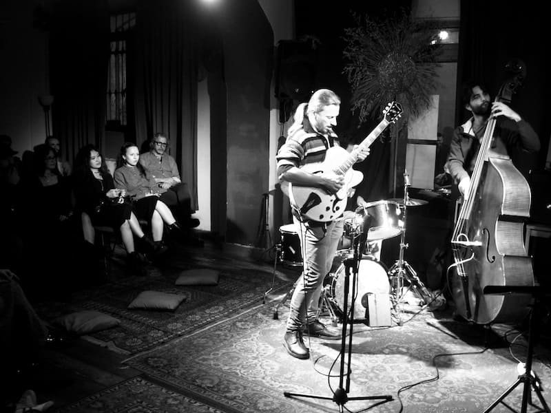 Ho realizzato questi scatti seguendo Andrea nei locali di Milano dove il jazz imperversa: La Corte dei Miracoli, l’O-stè, il Tin Cocktail Bar, il Gramm Café, Il Baretto del Leoncavallo, il Garage Moulinski, il Bachelite CLab, il Dasein, e l’Osteria del Jazz. Locali che proseguono la grande tradizione milanese degli anni che furono, quando Le Scimmie, il Capolinea, il Nidaba, La buca di San Vincenzo, e prima ancora il teatro Girolamo e la Taverna Messicana, rappresentavano luoghi di pellegrinaggio per gli amanti di questo genere.