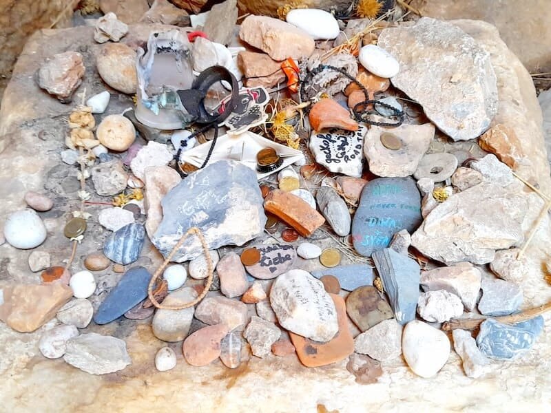 La prima tappa consiste in un breve raccoglimento nel piccolo tempio dedicato nell’antichità a Poseidone. I Greci credevano che qui ci fosse uno degli ingressi nell’Ade, il regno dei morti. Visitatori, turisti e, perché no?, pellegrini lasciano un segno del proprio passaggio: chi una moneta, chi un sassolino con una dedica o una preghiera, chi una cartolina, chi una candela. Qualche anno fa ho lasciato un biglietto da visita, ma il New York Times non si è fatto vivo…