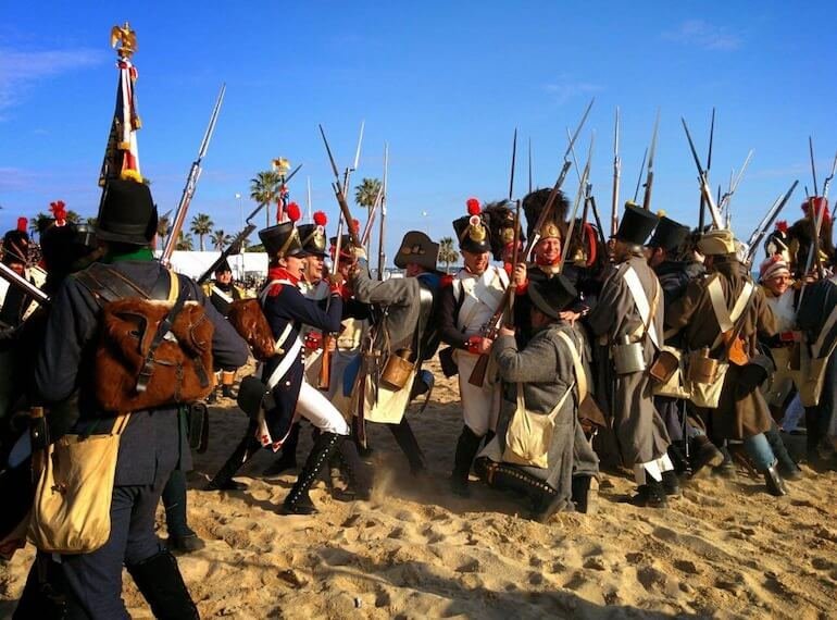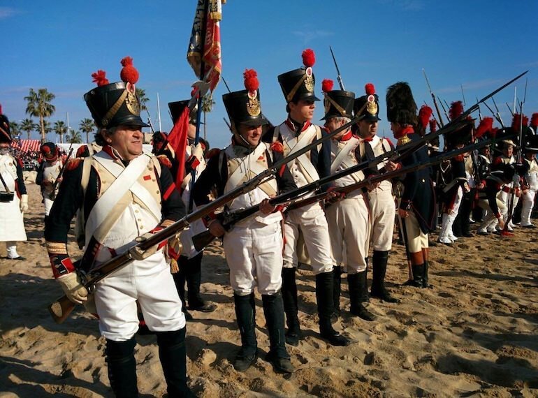 IMG_8405Voilà le soleil de Golfe-Juan! L’astro fulgente non è salito in cielo per salutare una vittoria storica come quella ottenuta sui campi innevati di Austerlitz, ma ha scaldato il pubblico venuto per accogliere Napoleone di ritorno dall’Elba, nel bicentenario del suo sbarco. Oltre un migliaio di reeenactors (“rievocatori”) provenienti da varie parti d’Europa si sono dati appuntamento sulla spiaggia della cittadina della Costa Azzurra dove l’Imperatore mise piede dopo i nove mesi del primo esilio. Curiosi e villeggianti si sono affacciati dai terrazzi e dai balconi degli edifici prospicienti il lungomare, mentre gli appassionati veri e propri hanno preferito acquistare un biglietto per accedere alla tribuna numerata.