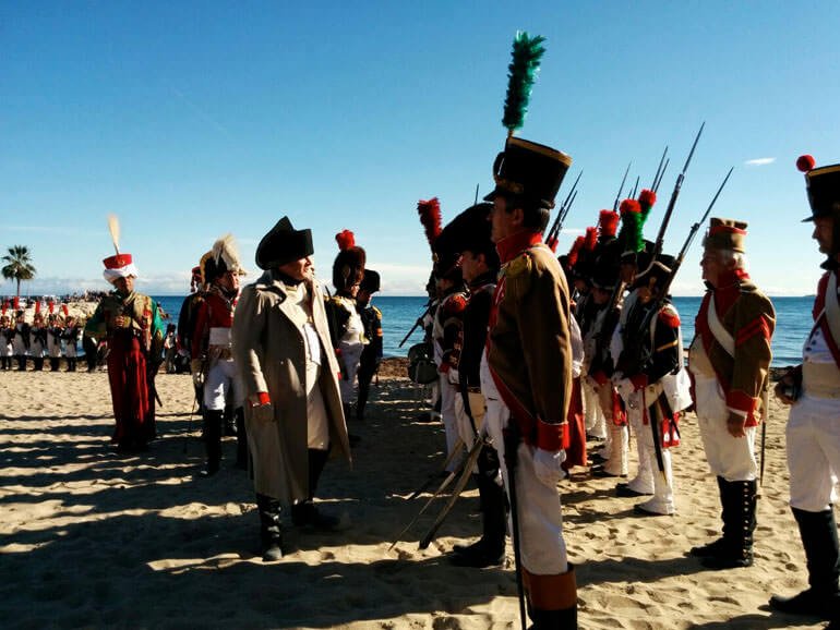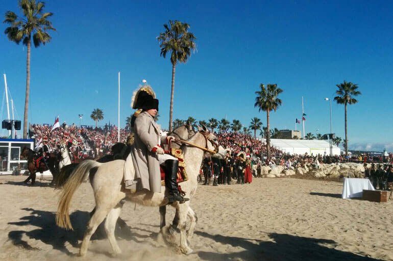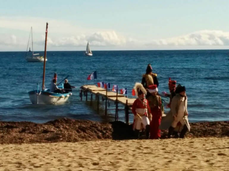 GolfeJuan_2_1Ha anticipato un po’ i tempi, ma si sa: lo spettacolo ha regole ferree che nemmeno un imperatore può trascurare. Il primo marzo 1815 Napoleone sbarcò a Golfe-Juan verso le quattro e mezza del pomeriggio. Ieri, invece, durante la celebrazione del bicentenario dello storico evento, l’attore che lo impersonava è sceso dalla passerella un po’ prima delle tre, sotto un sole spettacolare che faceva già primavera in Costa Azzurra. Sulla spiaggia i pennacchi degli shakò e dei colbacchi dei reenactors ondeggiavano al vento. Qualche tempo prima che la rievocazione vera e propria avesse inizio, Alain Pigeard, presidente dell’associazione Souvenir Napoléonien, dava indicazioni a Napoleone, mentre Roustam, il fedele mamelucco dell’Imperatore, chiacchierava affabilmente con una dama in costume. L’impugnatura del suo pugnale risplendeva al sole, ma era soprattutto il suo abito orientale a destare la curiosità degli spettatori. Così Monsieur Pigeard rievocava la storia della guardia del corpo che dormiva stesa davanti alla porta della camera di Napoleone. Intanto alcuni addetti predisponevano il tappeto sulla passerella che Napoleone avrebbe percorso per sbarcare a terra e mettere di nuovo piede in Francia dopo l’esilio all’Isola d’Elba. Ma non era un red carpet: il colore si sarebbe potuto infatti definire grigio Marengo.