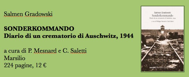 Ora, che la testimonianza dell’ebreo polacco Salmen Gradowski, Sonderkommando – Diari di un crematorio di Auschwitz, 1944, tradotta in Italia da Marsilio nel 2002 e appena riproposta in edizione tascabile, si situi proprio in quel punto dirimente, pare difficile dirlo. Egli faceva parte della squadra speciale (Sonderkommando, appunto) di ebrei adibito a chiudere la pratica nei forni crematori e nelle camere a gas del campo di Birkenau. Le carte (i rotoli), scritte in yiddish, furono ritrovate accidentalmente nel terreno, mesi dopo la fine della guerra.