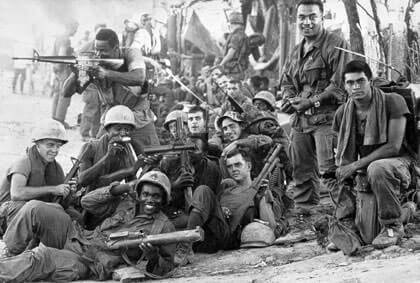 Il 1968 è l’anno del Tet, l’attacco vietcong al sud del Vietnam in occasione del capodanno buddista. In una foto vediamo soldati americani della 9° divisione alle prese con la costruzione di un ponte sul delta del Mekong. In primo piano un soldato imbraccia un trombone, mentre il centro dell’immagine è occupato da un elicottero che trasporta un battello. La guerra non è fatta solo di azioni belliche, ma anche di operazioni logistiche e di svaghi. Più avanti, una foto mostra le accoglienze calorose riservate alle attrici che accompagnano Bob Hope, durante lo spettacolo natalizio a Saigon.