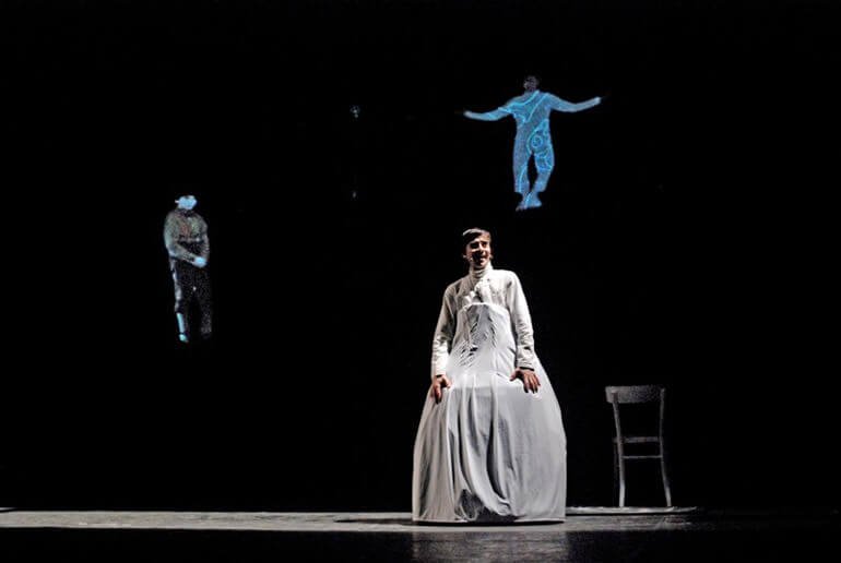 Lo spettatore viene immediatamente spiazzato dalla proiezione di un video in cui compare un ragazzino che pontifica, con una loquela e una gestualità degne di Philippe Daverio, sulla possibilità o meno di rappresentare oggi una tragedia. E che dire del rapporto tra mito e rito? Anticipa che no, Dioniso non sarà sulla scena.