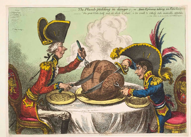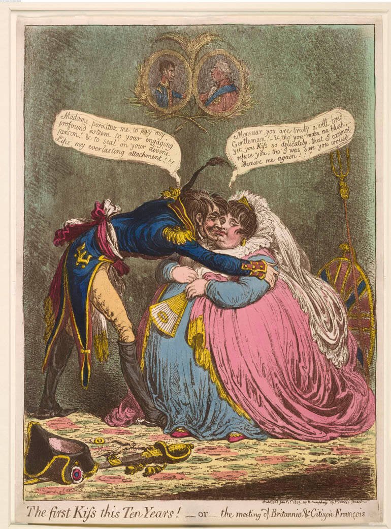 Gli autori di satira miravano al ventre e al cuore dei propri lettori, tuttavia le loro opere erano tutt’altro che elementari e ingenue. Spesso rimandavano a modelli classici o elevati, che soltanto i più istruiti potevano cogliere appieno. È il caso per esempio della stampa che mostra un Bonaparte con fattezze da coccodrillo (allusione alla sconfitta egiziana ma anche alla falsità del suo comportamento) nell’atto di disperdere l’assemblea delle rane, aperta citazione di una celebre favola di Esopo. Ancora più raffinato il richiamo sotteso alla scena del pranzo di Napoleone con i suoi ufficiali: il Festino di Baldassare, di Rembrandt, conservato alla National Gallery. Nel 1800 bastano otto vignette per riassumere la vita di Napoleone, allora appena trentenne. Ciascuna batte sul tasto del falso comportamento democratico del protagonista e il visitatore meno ingenuo non può che rimanere un po’ sorpreso dalla scelta degli argomenti da parte di autori sinceramente monarchici…