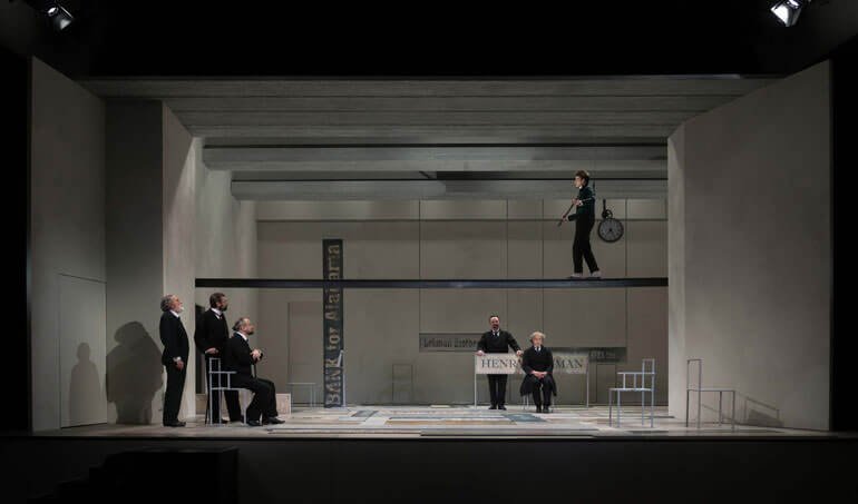 LehmanTrilogy_1La parabola è una catena i cui anelli sono quadretti dai titoli evocativi, scritti a mano su una parete. Sono in yiddish, ebraico, inglese e tedesco, le lingue parlate dai componenti della famiglia Lehman. Si comincia con Luftmensch, il Sognatore, per finire con lo Squash, lo sport per eccellenza degli yuppies anni Ottanta e Novanta. In mezzo ci sono l’amore, il lutto, le feste comandate, la terribile crisi del 1929 che avrà bisogno di un nuovo Noè pronto a portare l’umanità in salvo dal diluvio, il vitello d’oro della borsa, il sogno di Martin Luther King e l’equilibrista Solomon Paprinskij che per decenni va avanti e indietro sulla sua fune senza mai cadere. Finché, naturalmente, non cade.