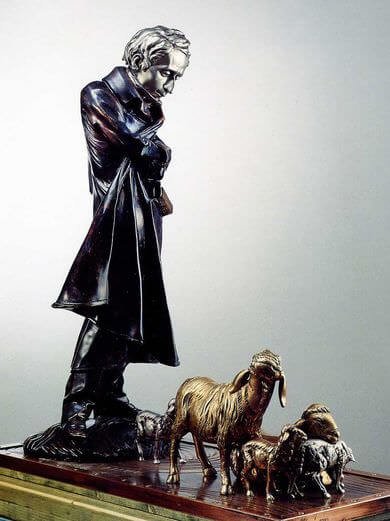 Nell’ultima stanza, come nella cella più sacra d’un tempio, si erge la scultura in bronzo, rame e argento denominata Move la greggia oltre pel campo. Qui il Leopardi acquisisce la terza dimensione e diviene a tutti gli effetti il protagonista del “Canto notturno di un pastore errante dell’Asia”. Guida cinque mansuete pecorelle, anche se il ricercato pastrano scuro lascia qualche dubbio circa la precisa identità. Ma proprio in questa simbiosi tra un illetterato archimandrita ed un intellettuale odierno riposa una delle intuizioni più care al poeta, che traspare anche ne “L’ultimo canto di Saffo” e in diversi passi dello “Zibaldone”. Tutti gli interrogativi che l’anima più semplice e primitiva solleva alla luna sul senso della vita indicano una profondità concettuale uguale a quella del filosofo di professione. Sulla base dell’esperienza sensibile, biologica e naturale, si giunge alle stesse conclusioni cui tendono i più raffinati saggi dei pensatori moderni. L’incredibile fascino del testo non sta nella novità tematica, ma nel modo di porre i quesiti, con un cantilenare che ricalca le nenie d’un passato remoto e per certi aspetti ha il sapore e l’afflato d’un poema biblico.