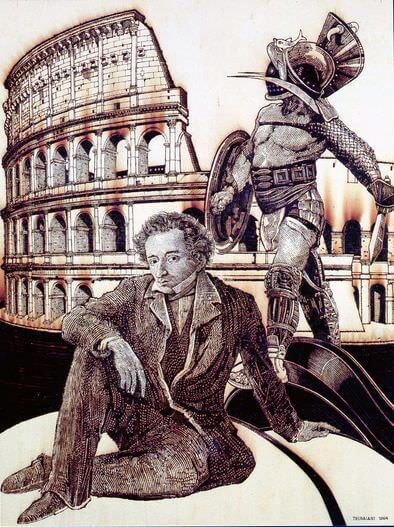 Per assistere ad un’osmosi vera e propria bisogna incontrare Valeriano Trubbiani. La sua, più che una scelta, sembra quasi una predestinazione. Nasce a Macerata, ossia ad un tiro di schioppo dal “villaggio” del poeta. E viene alla luce nel 1937, cioè cent’anni esatti dopo la scomparsa a Napoli del letterato in grado di toccare le corde più profonde dell’animo. La devozione nei confronti dell’esimio conterraneo inizia in famiglia.