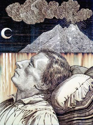 Uno dei pannelli finali vede Giacomo sul letto di morte a Torre del Greco, presso villa Ferrigni. Nel buio fa capolino sulla sinistra una falce luminosa, che richiama la penultima perla letteraria dello scrittore: “Il tramonto della luna”. La stupenda apertura paesaggistica recita tra l’altro: “Giunta al confin del cielo, / dietro Appennino od Alpe, o del Tirreno / nell’infinito seno / scende la luna; e si scolora il mondo; / spariscon l’ombre, ed una / oscurità la valle e il monte imbruna; / orba la notte resta”. Ma voi, colline e spiagge, “orfane ancor gran tempo / non resterete: che dall’altra parte / tosto vedrete il cielo / imbiancar nuovamente, e sorger l’alba”. Tutt’altro destino tocca invece agli umani. Infatti “la vita mortal, poi che la bella / giovinezza sparì, non si colora / d’altra luce giammai, né d’altra aurora. / Vedova è insino al fine; ed alla notte / che l’altre etadi oscura, segno poser gli dei la sepoltura”.