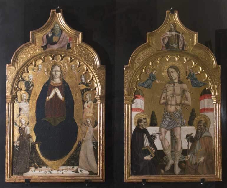 Stendardo processionale di Luca di PaoloDi sala in sala ci si può divertire a confrontare le varie versioni del martirio di San Sebastiano, comprese quelle extra percorso, contando il numero di frecce con cui ciascun pittore ha sfregiato (ma per la sua gloria!) il corpo del povero santo. Dai sette dardi di Lorenzo di Giovanni de Carris da Matelica (detto chissà perché Giuda…), alle undici frecce che hanno colpito il Sebastiano in posa sullo stendardo processionale di Luca prestato dalla Pinacoteca di Brera. Ma anche queste sono carezze rispetto agli oltre venti dardi scagliati contro Sebastiano nella tavola di Giovanni Bellini!