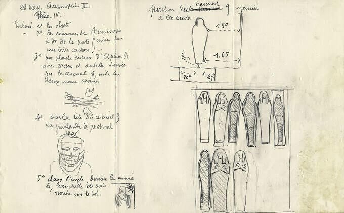 Personalmente mi sono soffermato in particolare sulle pagine del giornale di scavo di Loret, con tanto di disegni come quello schizzato per descrivere la posizione dei 9 sarcofagi, e sulle fotografie d’epoca delle mummie, tra cui quella del faraone Seqenenra Ta’o, della XVII dinastia: le terribili ferite da taglio testimonierebbero la lotta contro gli Hyksos. Non andò bene al sovrano, ma suo figlio Ahmose I riuscì a cacciare gli invasori, dando inizio a una nuova dinastia.