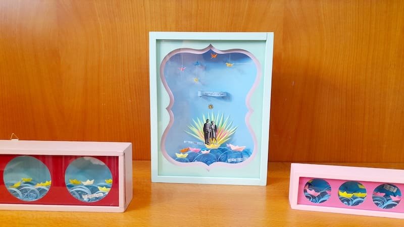 Avessi una briciola di talento artistico, mi piacerebbe cimentarmi nell’impresa – folle o gratificante, o entrambe le cose? – di racchiudere il mondo in una scatola. È quello che fa Simona Cozzupoli, almeno per come mi appare guardando i suoi microcosmi con nuvole fatte di batuffoli di cotone e onde del mare che si accavallano di strisciolina in strisciolina. Su quelle onde stanno in equilibrio nella navigatio vitae – Siamo sulla stessa barca! – colorate barchette che si immaginano tanto resistenti quanto alla vista fragili.