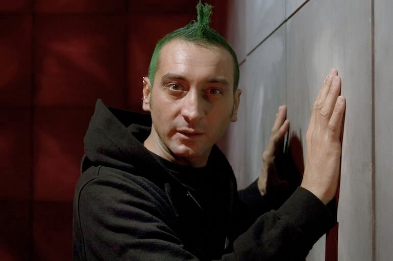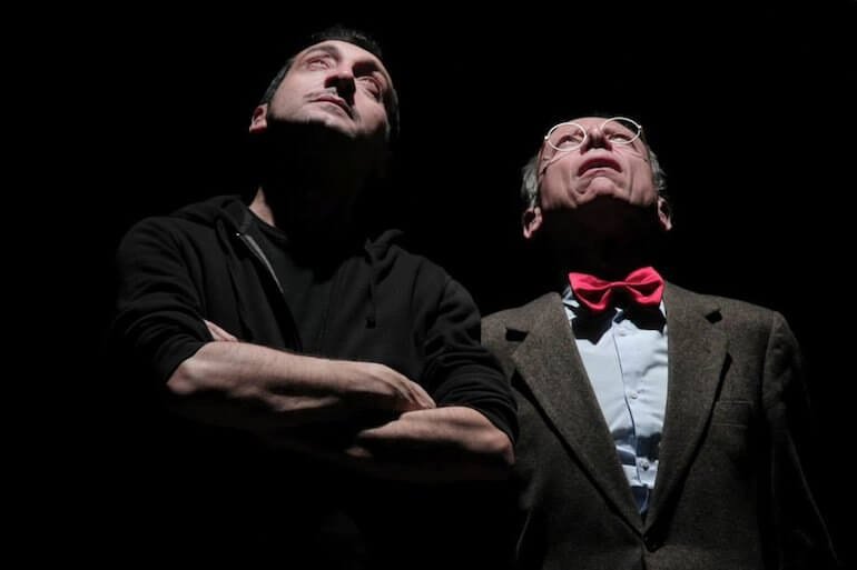 Intanto il nuovo re si dà da fare con l’ex cognata appena sposata e inanella una gaffe dietro l’altra, mentre la povera Ofelia sale sull’altalena degli umori del suo amato Amleto e l’inseparabile coppia Rosencrantz e Guildenstern trascina gli spettatori nel teatro dell’assurdo (del resto la realtà “è” il teatro dell’assurdo…). Bravissimi nei rispettivi ruoli Giovanni Carretti e Marco Brambilla che danno vita a due simpatici marmittoni caduti in un gioco più grande di loro, da cui non usciranno vivi. Corrado d’Elia è un giovane Amleto dalla cresta verde, in piena crisi adolescenziale, schiacciato dalla tragedia ma soprattutto amaramente stupito che il resto del mondo non prenda le sue parti. Urla, si sbraccia e occhieggia come un ragazzino ribelle, invasato dalla musica da rave party che viene sparata dagli altoparlanti: altro che luci stroboscopiche!