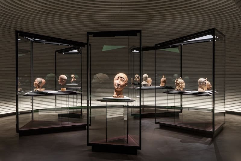 Lungo il percorso “milanese”, che si snoda dal Piano Ipogeo (a fare la guardia è il Leone urlante di Mirko Basaldella: una scelta davvero azzeccata quanto scenografica!) fino al Piano Nobile del Museo, i visitatori hanno modo di verificare quanto l’arte novecentesca debba agli antichi Etruschi e quanto, spesso, sia difficile assegnare a colpo sicuro a uno o all’altro dei corni temporali presi in esame un vaso o una scultura tra le opere esposte. È il caso per esempio della teca che ospita tre teste: una è opera di Dino Basaldella (fratello di Mirko), la seconda di Quinto Martini e la terza di un anonimo artista (chi penserebbe di definirlo artigiano?!) dei primi decenni del I sec. a.C.