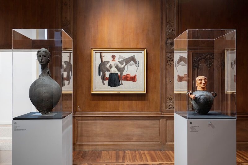 A qualche passo di distanza un ex voto zoomorfo in terracotta del III secolo a.C. condivide la teca con un Piccolo cavaliere di Marino Marini, in terracotta policroma, prestato dalla Fondazione di Pistoia dedicata all’artista. Numerose sono le opere arrivate da fondazioni e archivi, come la Testa del 1978 (dalla serie Il sorriso verticale della Gioconda) di Roberto Matta concessa dagli Archivi Matta.