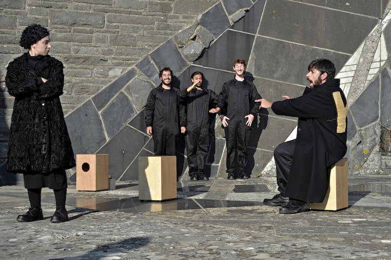 Ad accogliere gli spettatori c’è Enrica Sangiovanni come dea della giustizia bendata, mentre è vestito come un boia medievale Gianluca Guidotti che fornisce una preziosa cornice temporale e psicologica al dramma sul punto di iniziare. Lo fa citando un appunto che Kafka segna sul suo diario alla data del 2 agosto 1914: «oggi la Germania ha dichiarato guerra alla Russia. Nel pomeriggio scuola di nuoto». Lo scrittore aveva appena iniziato Il processo e si congedava da uniformi e bandiere.