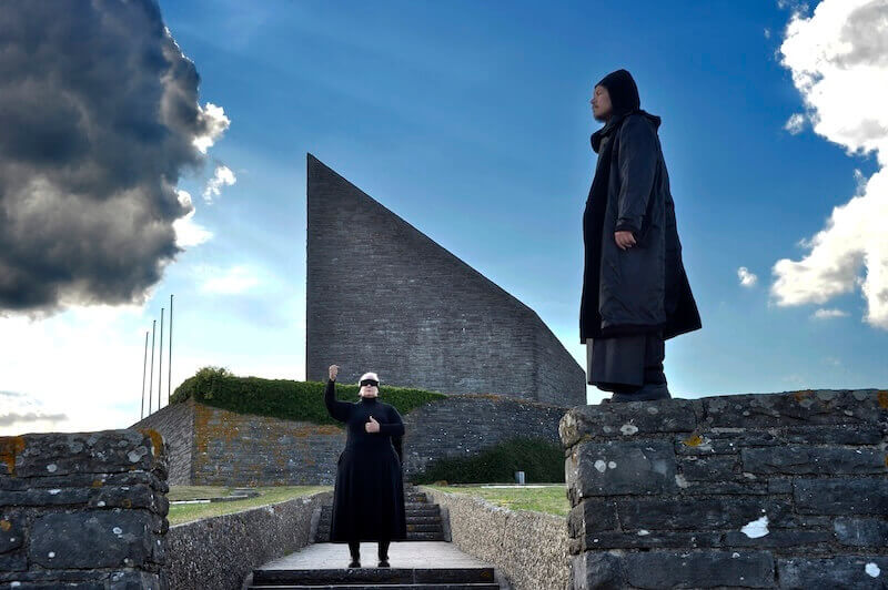 Il senso di claustrofobia che già si avverte nella corte del Cimitero si amplifica nella sala interna, soprattutto quando viene chiuso il cancello e gli spettatori si sentono davvero imprigionati mentre assistono alla bella perorazione di K. (“Io non cerco il successo oratorio”, ricorda la celebre orazione di Marco Antonio al funerale di Cesare nel dramma shakespeariano).