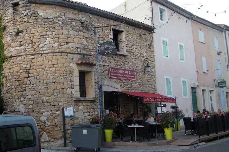 Trovo il ristorante: Le Donjon de Louis (ci avevo già cenato dodici anni fa, quando si chiamava solo Le Donjon), che prende, appunto, il nome dal torrione (o “dongione”) che ha di fianco. Restaurant italien – Pizza au feu de bois – Vallocco dice la grande insegna rossa sopra l’ingresso. Una giovane cameriera, minuta e assai graziosa, mi fa accomodare a un tavolino della terrazza esterna.