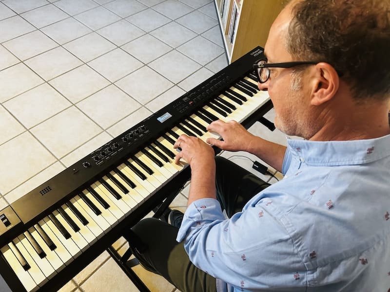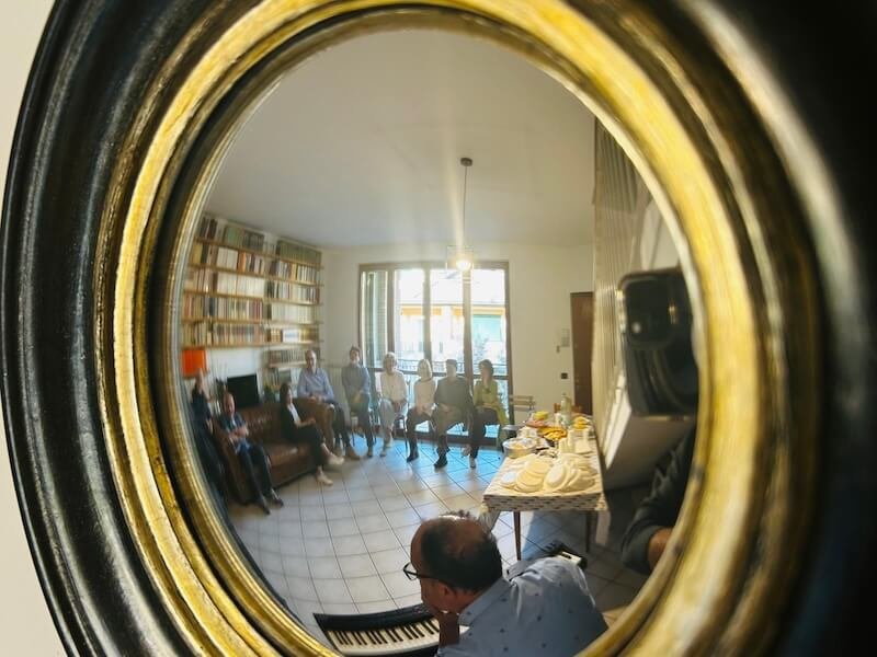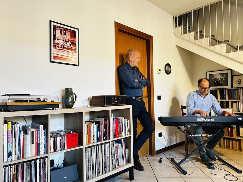 Ma è il momento di tornare alla novità anticipata in apertura: ad accompagnare l’inaugurazione della MicroMostra di Simone Cozzi è stato l’amico e compagno di molte iniziative Andrea Giussani. Il musicista brianzolo non solo ha mostrato la sua maestria – suonando senza spartito – ma ha anche catturato l’attenzione degli ospiti dialogando con Simone e il sottoscritto a proposito di jazz e dell’influenza reciproca con la musica classica, per esempio in Stravinskij, e della pratica della trascrizione musicale (nelle sue varie declinazioni), a cui proprio in settimana ho dedicato un incontro alla Biblioteca Ostinata di Milano ospitando il chitarrista classico Giacomo Copiello, ideatore e organizzatore di Trascrizioni Festival a Vicenza (in autunno ci sarà la terza edizione).