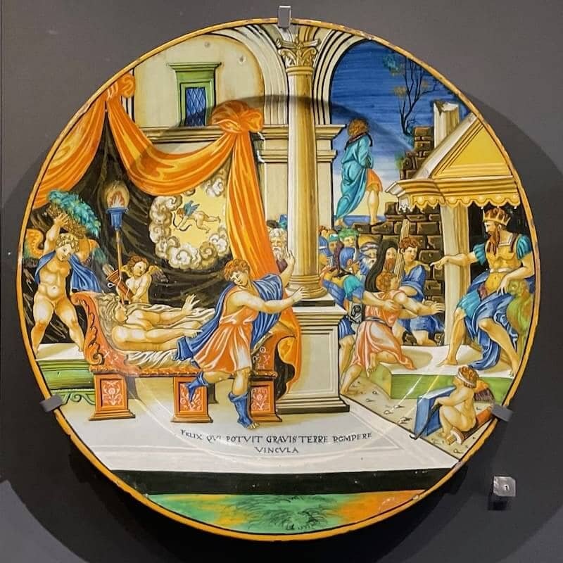 L’ho visitato diverse volte e mi sono fatto una classifica di opere preferite, come il Piatto con Giuseppe e la moglie di Putifarre realizzato da Francesco Xanto Avelli a Urbino nel 1537, in maiolica, entrato nella collezione come lascito di Louis Carrand nel 1888. Sotto i piedi del figlio di Giacobbe corre la scritta Felix qui potuit gravis terre (sc. terrae) solvere vincula. Viene dal III libro del De consolatione philosophiae, opera composta giusto mille anni prima (nel 523/4 circa) da Severino Boezio, mentre era in carcere nei pressi di Pavia in attesa dell’esecuzione capitale.