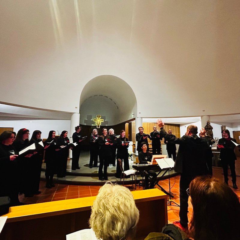Il direttore (e fondatore) del coro, Luca Colombo, ha spiegato al folto pubblico che il programma era diviso in due parti, la prima di tematica mariana, la seconda dedicata alla Natività. E anche in questa occasione il concerto si è chiuso con la partecipazione dei presenti, invitati a unirsi al coro per Adeste fideles. In realtà c’è poi stato spazio per un bis, ovvero il brano Three Kings di Peter Cornelius.