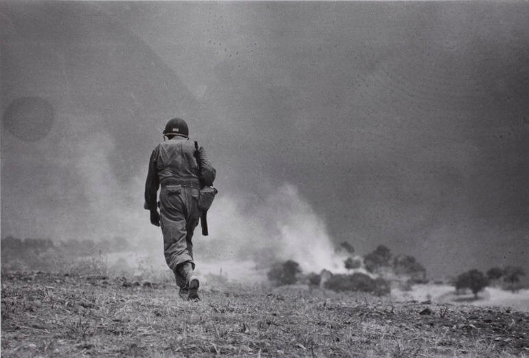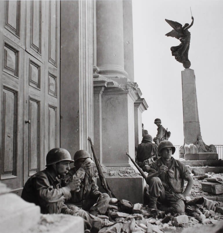 Le immagini in mostra allo Spazio Oberdan raccontano momenti della risalita degli Alleati, dalla Sicilia verso Roma nel biennio cruciale della seconda guerra mondiale. Colpiscono le uniformi dei soldati statunitensi, così diverse da quelle dei soldati ipertecnologici di oggi e quante sigarette! Fumano tutti: il generale Theodore Roosevelt, figlio del presidente degli Stati Uniti, mentre parla a un soldato della seconda Divisione di fanteria marocchina; il carabiniere che porge dell’acqua a un soldato americano a Troina, nell’agosto del 1943; l’uomo che porta in braccio una bambina ferita a una gamba (sua figlia?). E naturalmente lui, Robert Capa, immortalato con la sigaretta in bocca da George Rodger a Napoli nel 1943: è la foto che apre il percorso. Poi ci sono immagini di appostamenti, perlustrazioni, marce, combattimenti e momenti di riposo, assistenza fornita ai feriti, soldati tedeschi fatti prigionieri, dolore e gioia per l’arrivo degli Alleati, devastazioni (come quella dell’Ufficio Postale Centrale di Napoli fatto saltare in aria dai Tedeschi con una bomba a orologeria che causò cento morti e moltissimi feriti).