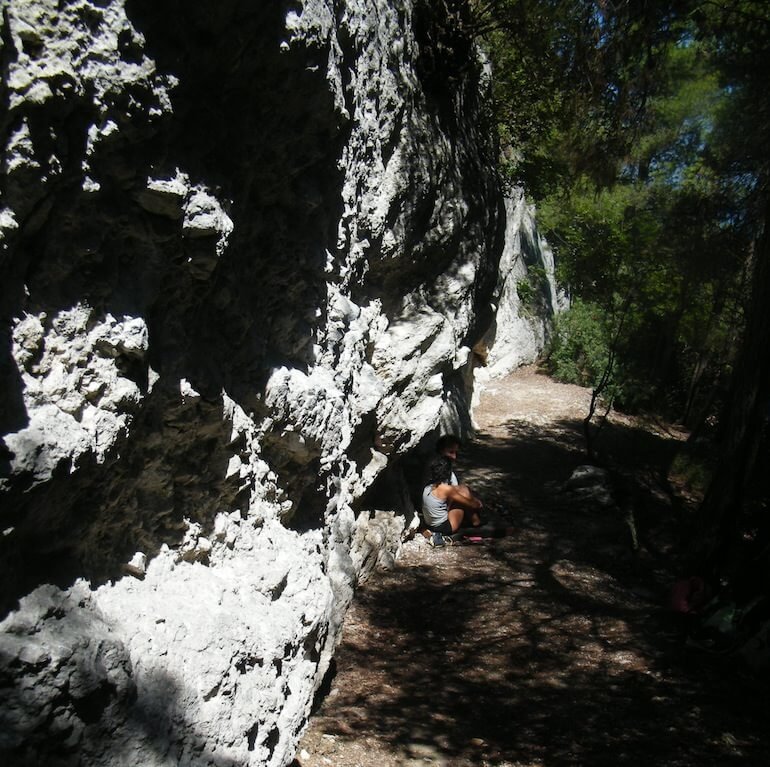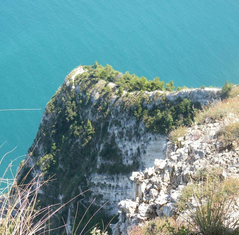 Il tratto di sentiero che dall’ex monastero scende verso il belvedere sud e quindi verso il paese è decisamente impegnativo: ripido, assai diseguale per rocce e sassi sporgenti o incavati, stretto… ma offre scorci magnifici sul mare, sulle Due Sorelle, sul Passo del Lupo…