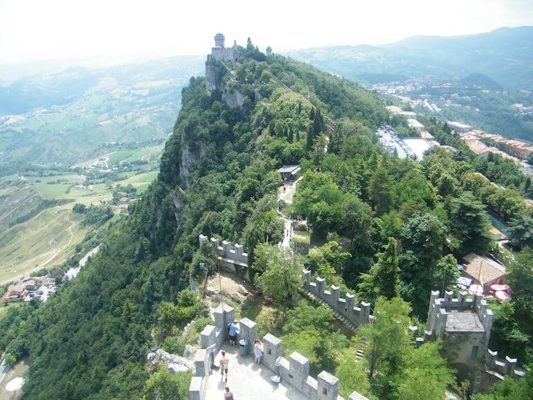 Non racconto la visita a San Marino: pur scattandovi alcune immagini dal punto più elevato della torre più alta (cui pervengo con una non facile arrampicata lungo una scala di legno quasi verticale e alcuni pioli di ferro murati), mi pare un borgo certo ben tenuto, ma troppo pieno di negozi per turisti (con scritte spesso in russo, anche per i menù esposti sulle lavagne), in molti dei quali si vendono armi bianche (comprese le spade da samurai e coltelli di tutti i tipi) e raffinatissime riproduzioni non letali di armi da fuoco modernissime…