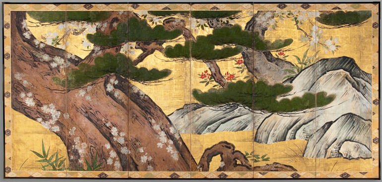 Paravento in sei pannelli; inchiostro, colore e oro su carta